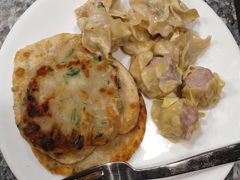 Pancake de cebollín en espiral, un delicioso platillo de la cocina china. Se sirve con salsa de soya y aceite de chile.