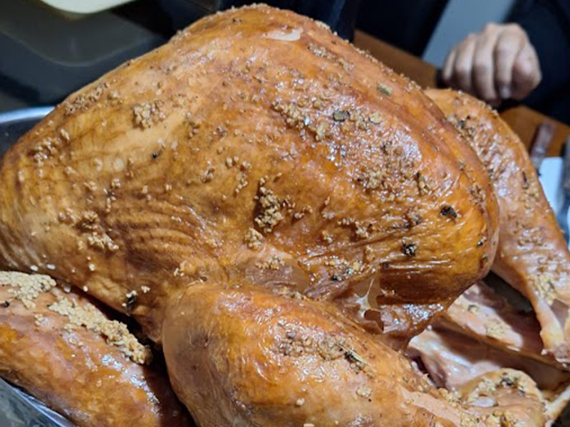 Pavo horneado con una mezcla de ajo y mantequilla.