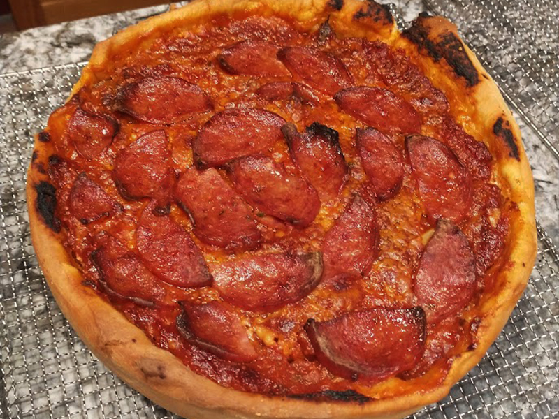 Una pizza gruesa, como una tarta, con salsa de tomate casera y salchicha italiana picante.