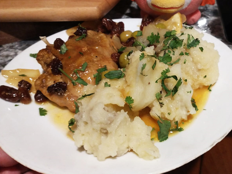Pollo al estilo norteafricano con limones, frutos secos y aceitunas verdes. Se sirve con puré de papas, ensalada o cuscús. Esta receta es de un amigo de mi esposo, le mandamos saludos.