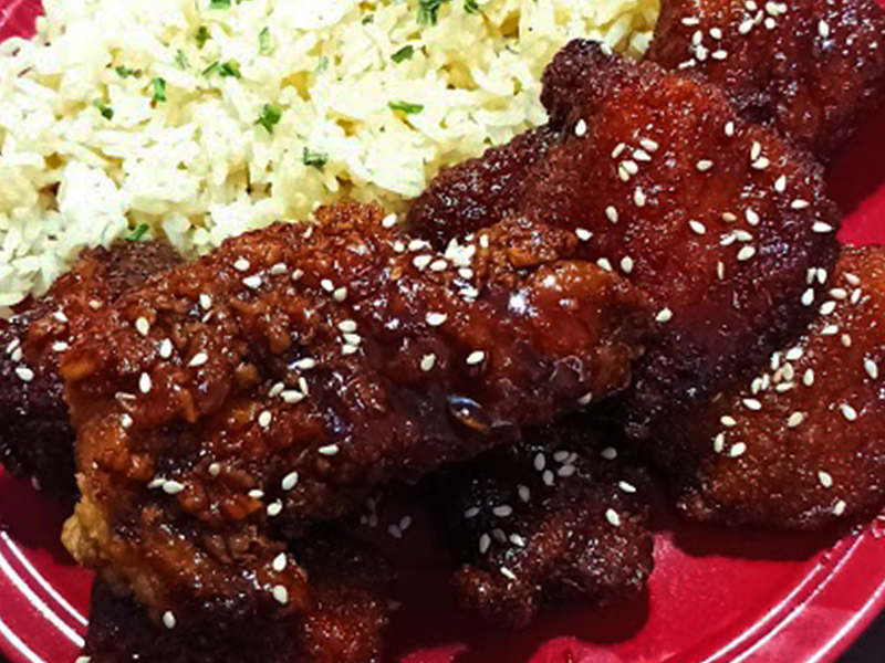 Pollo frito coreano con salsa picante y dulce. Se sirve con papas o camotes fritos, arroz o fideos.